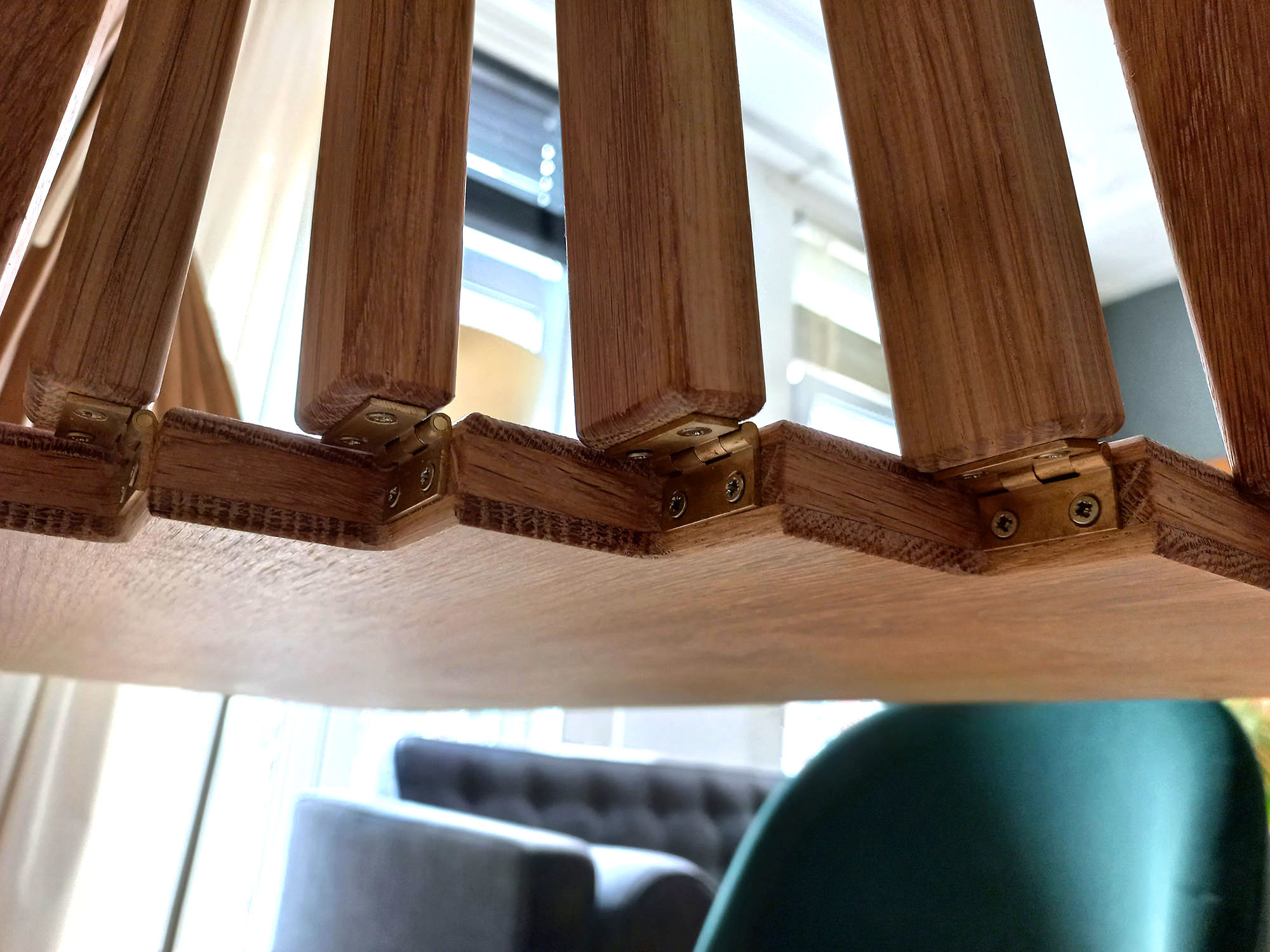 To make this art functional, DX brass narrow hinges are used. Creating a working prototype takes at least three months. After that, everything needs to be fine-tuned. Depending on the product, around 30 to 130 narrow hinges are used, all of which are assembled manually. In the beginning, Robert Embriqs made all the furniture pieces himself, but nowadays, he collaborates with an external party. It remains manual work, with each hinge pre-drilled and then manually screwed in place.