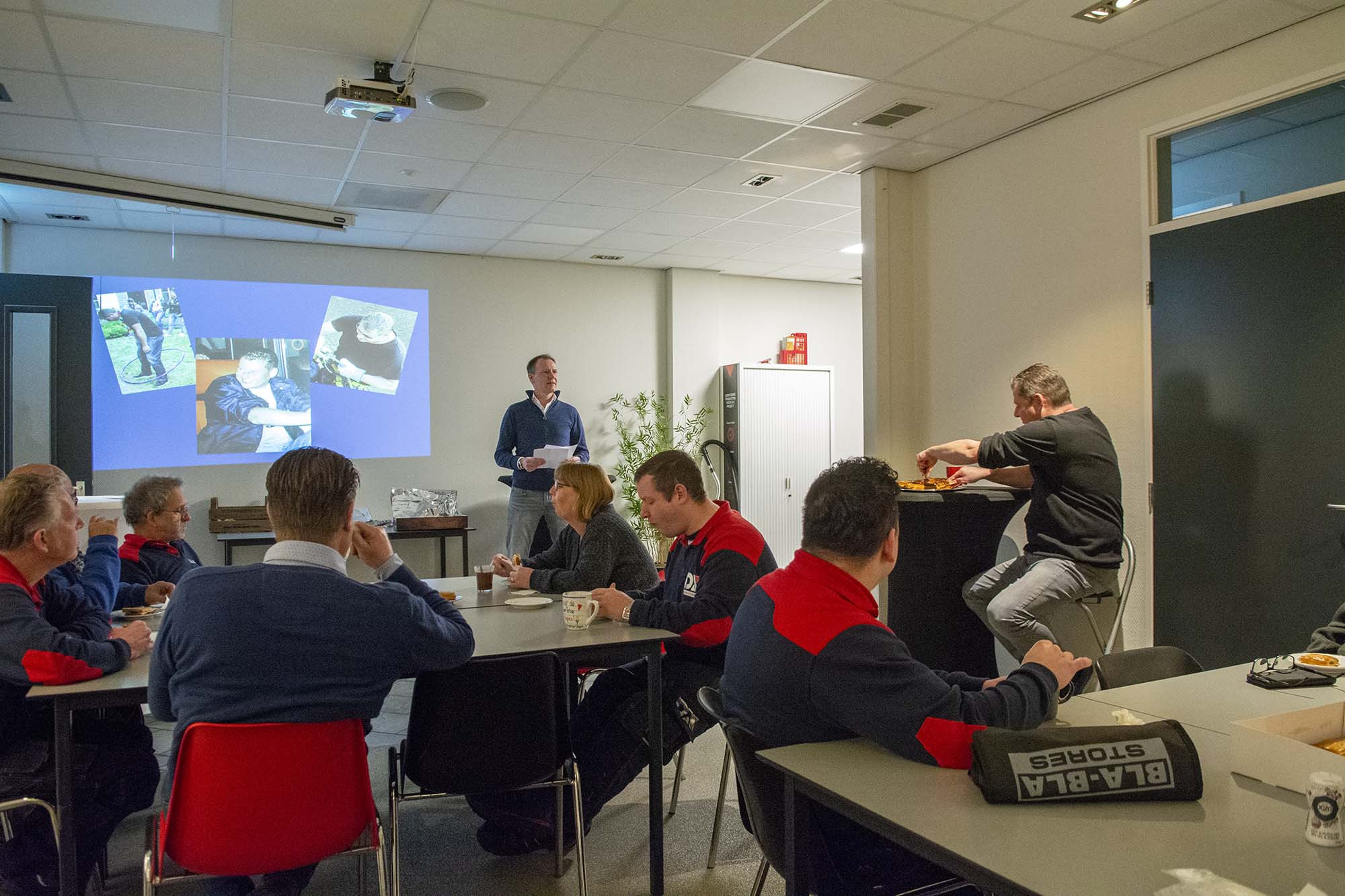 Een terugblik op de 25 werkzame jaren van Jan kon natuurlijk niet ontbreken. Daarom verzamelden we met zijn allen in de kantine om Taco's terugblik op de laatste 25 jaar met Jan te horen. De presentatie werd afgetrapt met waar we Jan allemaal om kennen: zijn liefde voor eten. Daarom speciaal voor Jan: Een mega saucijzenbroodje.