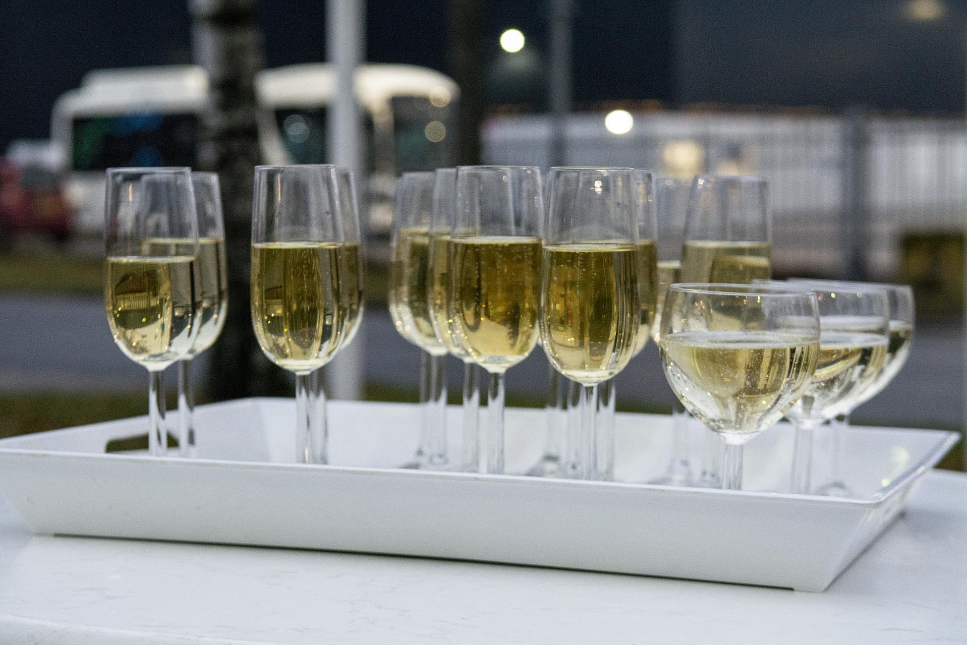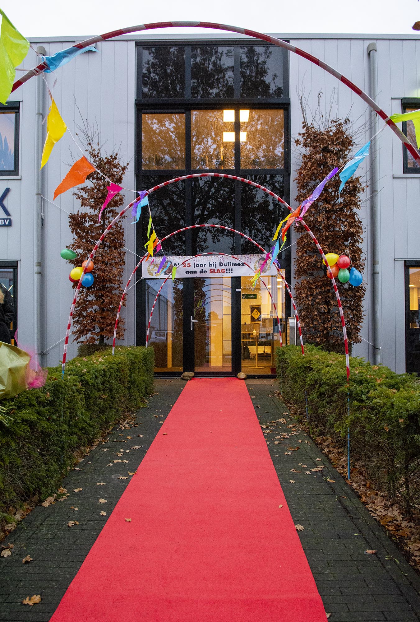 Jan werd door alle collega's hartelijk verwelkomd! Met een prachtige bos bloemen in zijn handen, opende Taco de achterdeur van de limousine. En daar stapte Jan uit! Na overhandiging van de bos bloemen en een felicitatie werd hij over de rode loper, naar de ingang geleid. Met een glas champagne proosten we met zijn allen op zijn 25 jarig jubileum!