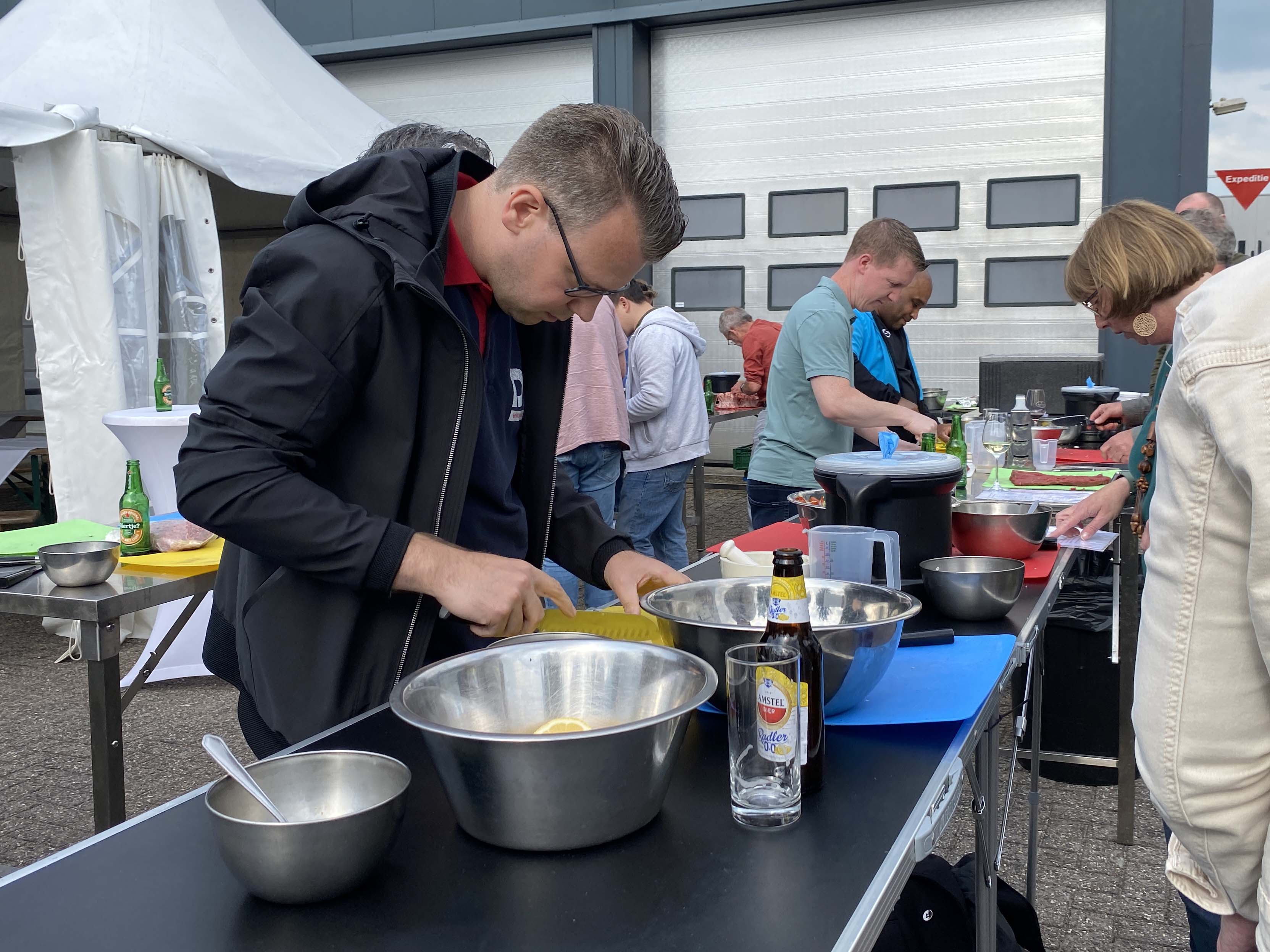 Het wordt anders dan anders. Dat is wat onze collega's wisten over deze editie van de jaarlijkse barbecue. Toen ze na het werk naar buiten kwamen zagen we eerst wat verbaasde gezichten bij het zien van de ingrediënten en de indeling: 'Moeten we zelf ons eten maken?'. 'Oef, groenten snijden'. Daar had niemand op gerekend. Maar de lege magen rommelden, dus hup een lekker drankje en aan de slag!