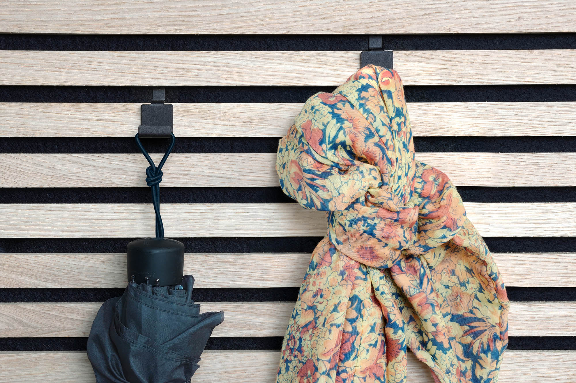 Een jas, tas, pet, sjaal of paraplu ophangen aan je akoestische wandpaneel? Maak je wandpaneel compleet met deze stijlvolle zwarte kapstokhaken. Deze universeel toepasbare haakjes worden vaak gebruikt op geluidswerende panelen in een gang of slaapkamer om kledingstukken op te hangen.