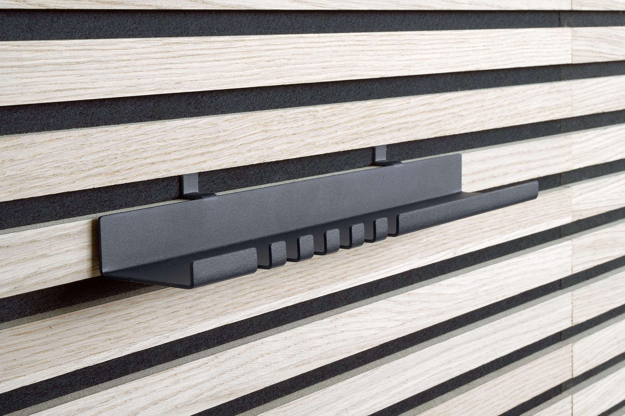 De plank is maakt van zwartgelakte staal en kan zowel op horizontaal als verticaal geplaatste panelen gemonteerd worden, zolang de tussenruimte van de lamellen minimaal 1 cm bedraagt. Tot slot is deze wandplank per stuk verkrijgbaar. Schroeven en pluggen worden meegeleverd.